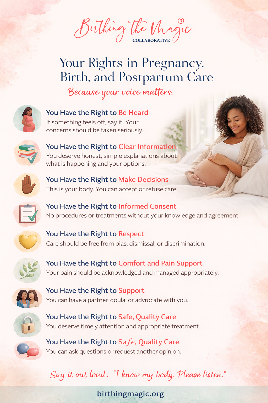 It is important to note that while this graphic is not a legal document or a formal regulation, it serves as a clear, accessible bridge to help birthing people understand and exercise their rights. It is a tool designed to ensure that both the institution and the individual provider remain committed to your safety, dignity, and autonomy.